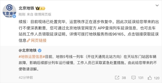 央視網(wǎng)消息:據(jù)@北京地鐵 微博消息,目前現(xiàn)場(chǎng)已處置完畢,運(yùn)營(yíng)秩序正在逐步恢復(fù)中。此前,北京地鐵發(fā)文稱,地鐵5號(hào)線一列車(開往天通苑北站方向)在天壇東門站因車輛故障,影響后續(xù)部分列車運(yùn)行緩慢,工作人員已采取緊急處置措施。