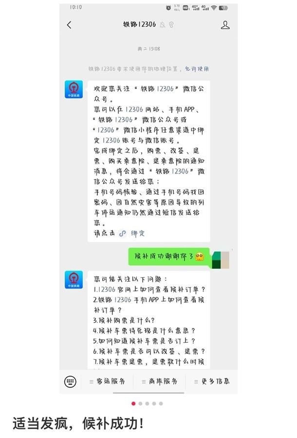 “你不理我是因?yàn)樵诮o我候補(bǔ)嗎”“親愛(ài)的我要票”……另一名網(wǎng)友也發(fā)帖稱,自己使用向12306微信公眾號(hào)“發(fā)瘋”的辦法,成功候補(bǔ)到了車票,其發(fā)布的網(wǎng)帖題為“適當(dāng)發(fā)瘋候補(bǔ)成功”。