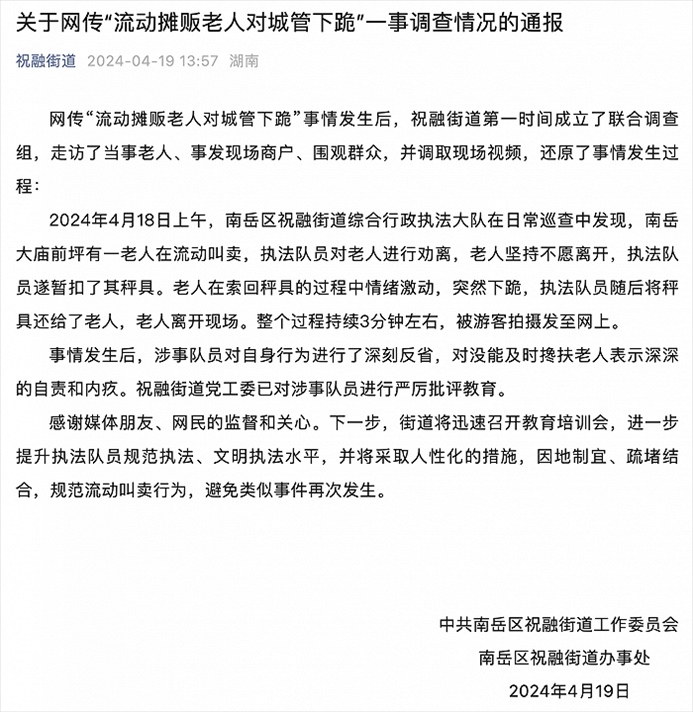 央視網(wǎng)消息:4月19日,衡陽南岳區(qū)祝融街道辦事處發(fā)布關于網(wǎng)傳“流動攤販老人對城管下跪”一事調(diào)查情況的通報。