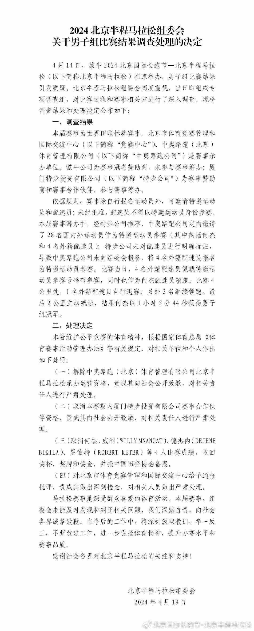 央視網(wǎng)消息:據(jù)@北京國際長(zhǎng)跑節(jié)-北京半程馬拉松 微博消息,2024北京半程馬拉松組委會(huì)發(fā)布關(guān)于男子組比賽結(jié)果調(diào)查處理的決定。詳情如下: