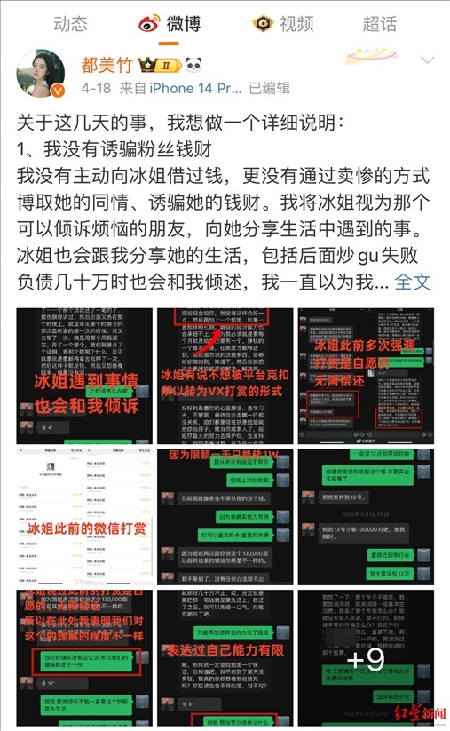 微博上,都美竹把上述朱姐說過的“無需你償還”“心甘情愿”、愿意供都美竹上大學的聊天截圖放在一起,表示朱姐“此前多次強調(diào),打賞是自愿的,無需償還”。