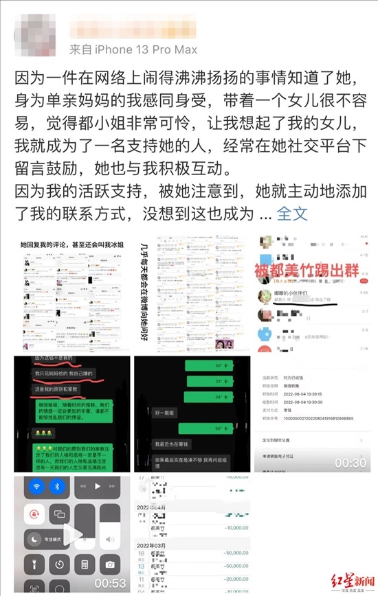 4月15日,都美竹粉絲朱姐發(fā)文稱,她先后給都美竹轉(zhuǎn)款近20萬元,現(xiàn)在認為都美竹“賣慘”騙錢。她希望都美竹還錢,但對方只給她轉(zhuǎn)了3萬元。