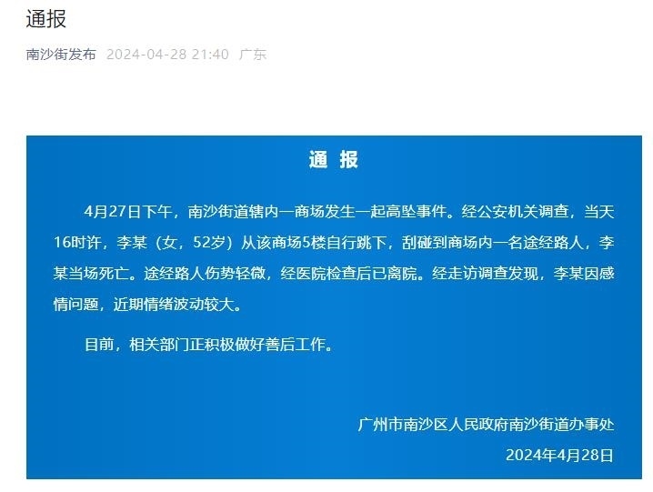 央視網(wǎng)消息:廣州南沙街道4月28日晚通報,4月27日下午,南沙街道轄內(nèi)一商場發(fā)生一起高墜事件。經(jīng)公安機關(guān)調(diào)查,當(dāng)天16時許,李某(女,52歲)從該商場5樓自行跳下,刮碰到商場內(nèi)一名途經(jīng)路人,李某當(dāng)場死亡。途經(jīng)路人傷勢輕微,經(jīng)醫(yī)院檢查后已離院。經(jīng)走訪調(diào)查發(fā)現(xiàn),李某因感情問題,近期情緒波動較大。目前,相關(guān)部門正積極做好善后工作。