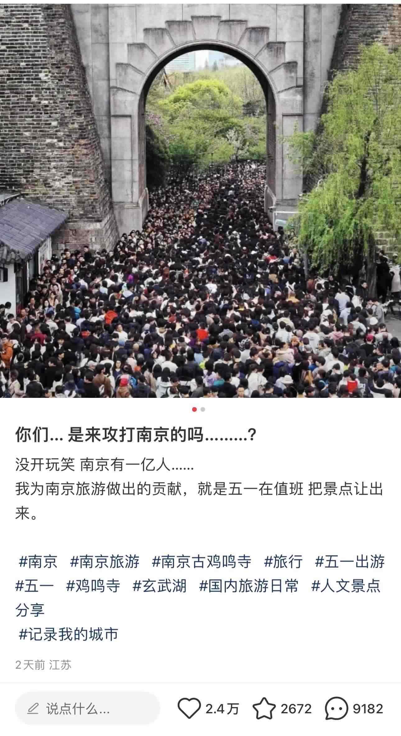 某定位顯示南京的網友表示:“我為南京旅游作出的貢獻,就是五一在值班,把景點讓出來?!?/p>