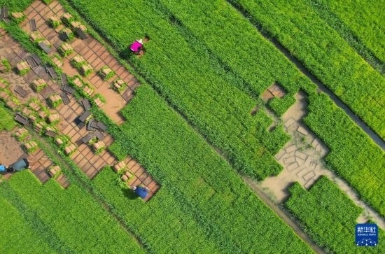5月5日,在四川省內(nèi)江市東興區(qū)長(zhǎng)江現(xiàn)代農(nóng)業(yè)園區(qū),農(nóng)民在集中育秧基地起秧苗(無(wú)人機(jī)照片)。
