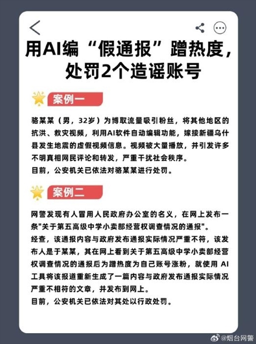 ·煙臺警方公布兩起“用AI編假通報蹭熱度”案例。