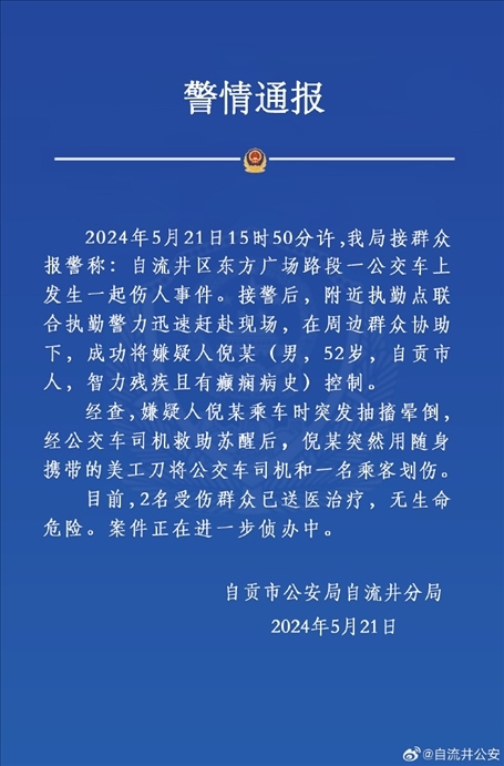 ·四川自貢警方通報“一男子在公交車上用美工刀劃傷司機和乘客”:男子智力殘疾且患有癲癇病史。