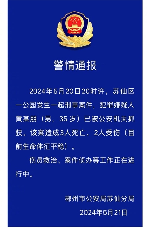 ·湖南郴州一公園發(fā)生刑事案件,致3人死亡2人受傷。