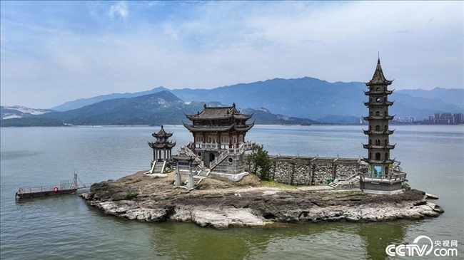 江西鄱陽湖進入豐水期,位于江西省廬山市境內(nèi)的鄱陽湖標志性景觀落星墩,隱入湖中成為“水中樓閣”。