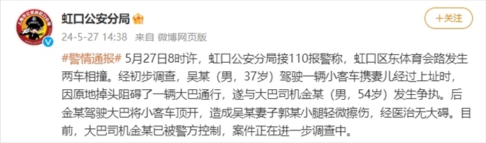 央視網(wǎng)消息:上海市公安局虹口分局發(fā)布警情通報(bào),5月27日8時(shí)許,虹口公安分局接110報(bào)警稱,虹口區(qū)東體育會(huì)路發(fā)生兩車(chē)相撞。經(jīng)初步調(diào)查,吳某(男,37歲)駕駛一輛小客車(chē)攜妻兒經(jīng)過(guò)上址時(shí),因原地掉頭阻礙了一輛大巴通行,遂與大巴司機(jī)金某(男,54歲)發(fā)生爭(zhēng)執(zhí)。后金某駕駛大巴將小客車(chē)頂開(kāi),造成吳某妻子郭某小腿輕微擦傷,經(jīng)醫(yī)治無(wú)大礙。目前,大巴司機(jī)金某已被警方控制,案件正在進(jìn)一步調(diào)查中。