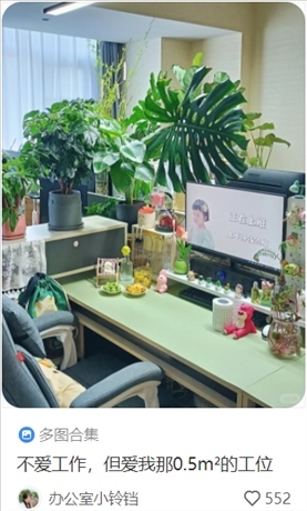 “按個(gè)人喜好裝修的工位可以讓年輕人在這一方小天地里可以獲得短暫的歸屬感與安全感,將目之所及之處都變成自己想要的樣子,令他們?cè)诳陀^條件有限的情況下盡可能讓自己感到舒適,也更容易從工作中感到幸福?!庇诠馊鸱治稣f。