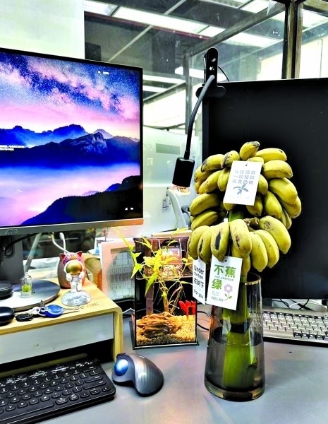 “現(xiàn)在大家工作都挺累的,職場(chǎng)里稍微有一點(diǎn)令人感到驚喜和有趣的話題,大家好像就會(huì)變得很開心。”吳圳是一名桌搭博主,自從他開始在辦公桌上養(yǎng)香蕉之后,單位的很多同事都會(huì)好奇地走過來瞧瞧。