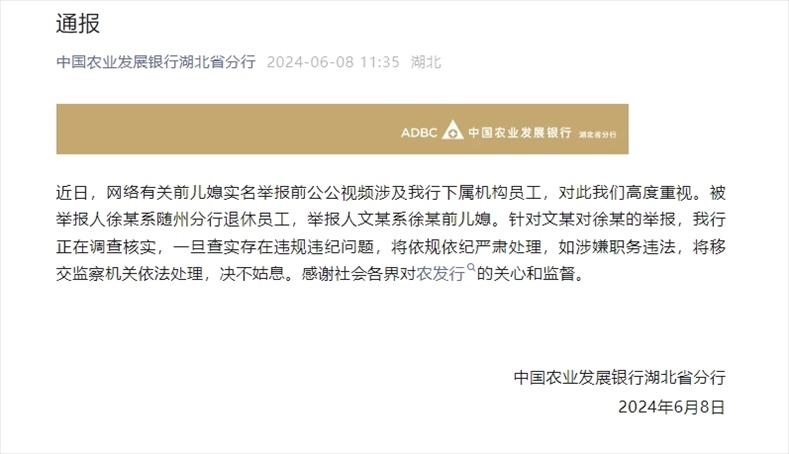 ·農(nóng)發(fā)行湖北分行通報(bào)“女子實(shí)名舉報(bào)前公公”:正調(diào)查核實(shí)。