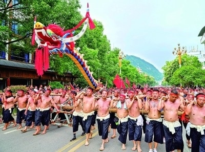 眾人抬著一艘近百米長(zhǎng)的特制龍舟前往河邊。