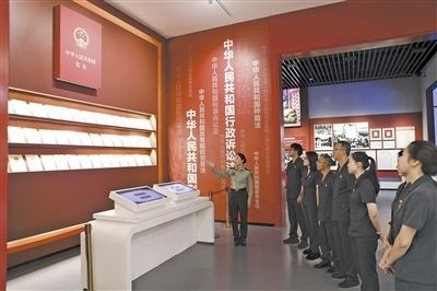 近日,江西省瑞金市人民法院分批次組織黨員干部前往中華蘇維埃共和國法制建設(shè)紀念館參觀學習,共同回顧紅色法治發(fā)展軌跡,賡續(xù)紅色法治血脈。紀念館中復(fù)原的“七里坪革命法庭”“馬錫五下鄉(xiāng)斷案”場景逼真且震撼,黨員干部不時駐足觀看,互相交流討論。圖為法院黨員干部聆聽講解。