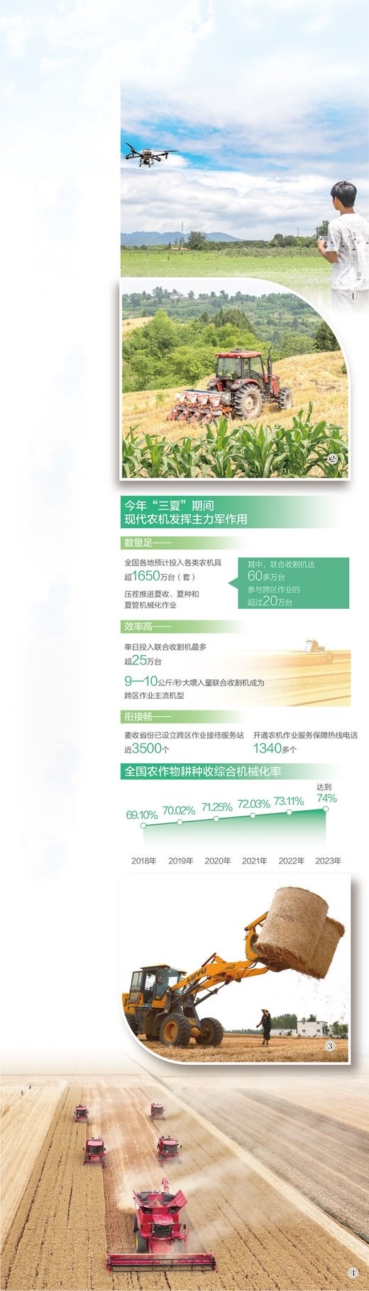 圖①:湖南省藍(lán)山縣塔峰鎮(zhèn)荷葉塘村,農(nóng)技人員操作植保無(wú)人機(jī)在田間進(jìn)行施肥作業(yè)。彭 華攝(人民視覺(jué)) 圖②:四川省蓬溪縣群利鎮(zhèn)五龍村,農(nóng)機(jī)手駕駛播種機(jī)開(kāi)展大豆玉米復(fù)合播種。吳奉家攝(人民視覺(jué)) 圖③:山東省棗莊市嶧城區(qū)古邵鎮(zhèn)新村,農(nóng)機(jī)手實(shí)施小麥秸稈裝車運(yùn)輸作業(yè)。孫 慧攝(人民視覺(jué)) 圖④:河南省舞陽(yáng)縣田間,聯(lián)合收割機(jī)高效開(kāi)展麥?zhǔn)兆鳂I(yè)。姚 彬攝(人民視覺(jué)) 數(shù)據(jù)來(lái)源:農(nóng)業(yè)農(nóng)村部