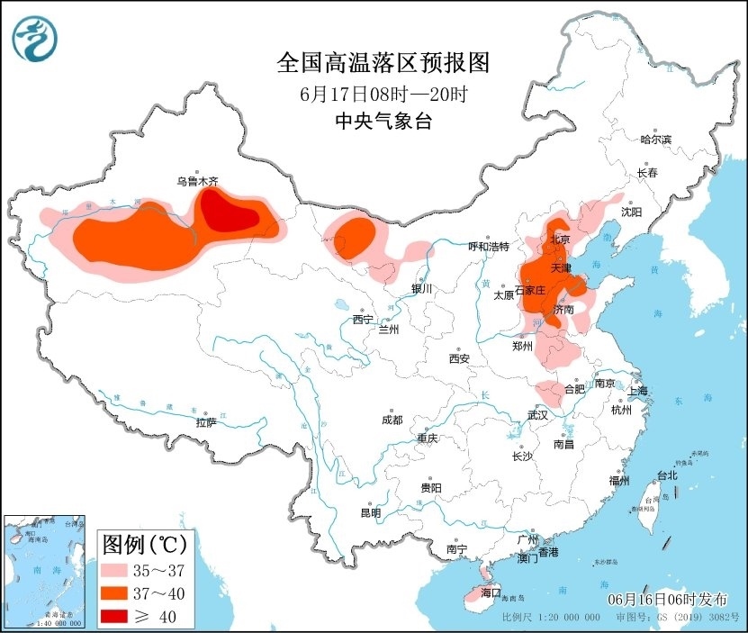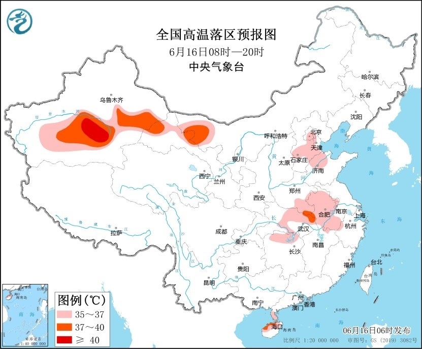 16日,華北、黃淮等地高溫強(qiáng)度將有所減弱、范圍將有所減小,但預(yù)計(jì)6月16日白天,內(nèi)蒙古西北部、新疆南疆盆地和東部、甘肅河西、河北中部、北京、山東西北部、河南東部和南部、安徽、湖北東北部、海南島北部等地仍有35~36℃高溫天氣,其中,內(nèi)蒙古西北部、新疆南疆盆地和東部、河南東南部等地部分地區(qū)最高氣溫37~39℃,新疆南疆盆地局地可達(dá)40℃以上。