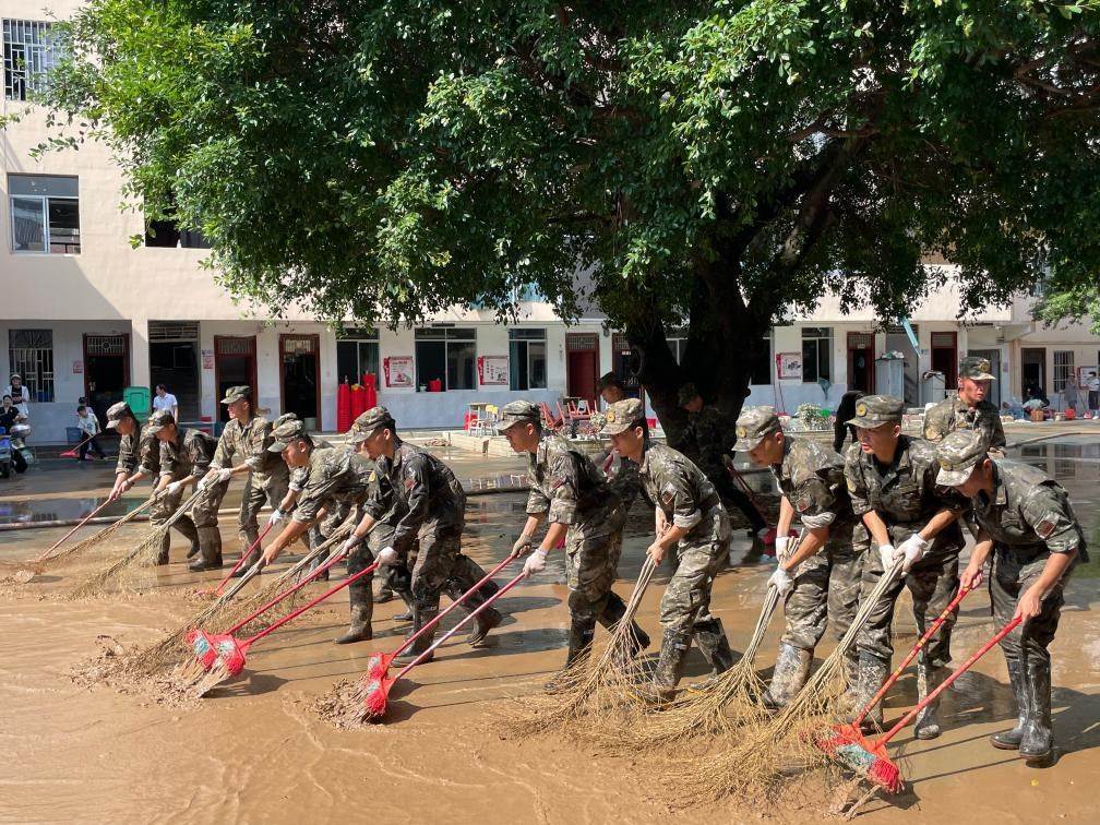 6月21日,武警廣西總隊桂林支隊的武警官兵正在幫助學校清淤。新華社記者李歡 攝