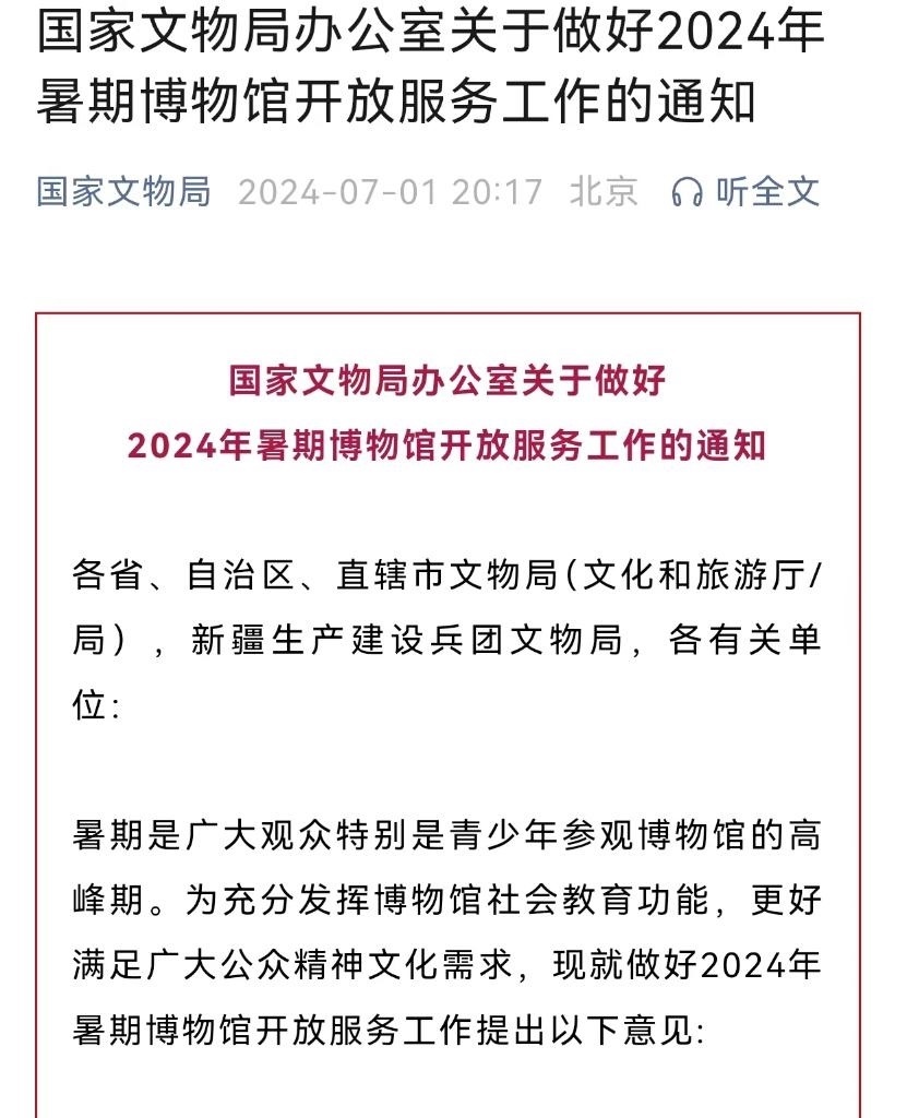國(guó)家文物局7月1日發(fā)出通知,就做好2024年暑期博物館開(kāi)放服務(wù)工作進(jìn)行部署。通知明確,各級(jí)文物行政主管部門要加強(qiáng)指導(dǎo),科學(xué)評(píng)估場(chǎng)館承載量,創(chuàng)新舉措,通過(guò)多種方式提高觀眾參觀博物館便利化水平。