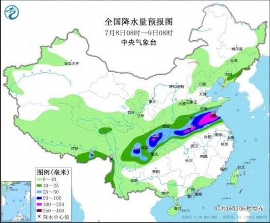全國(guó)降水量預(yù)報(bào)圖(7月8日08時(shí)-9日08時(shí))