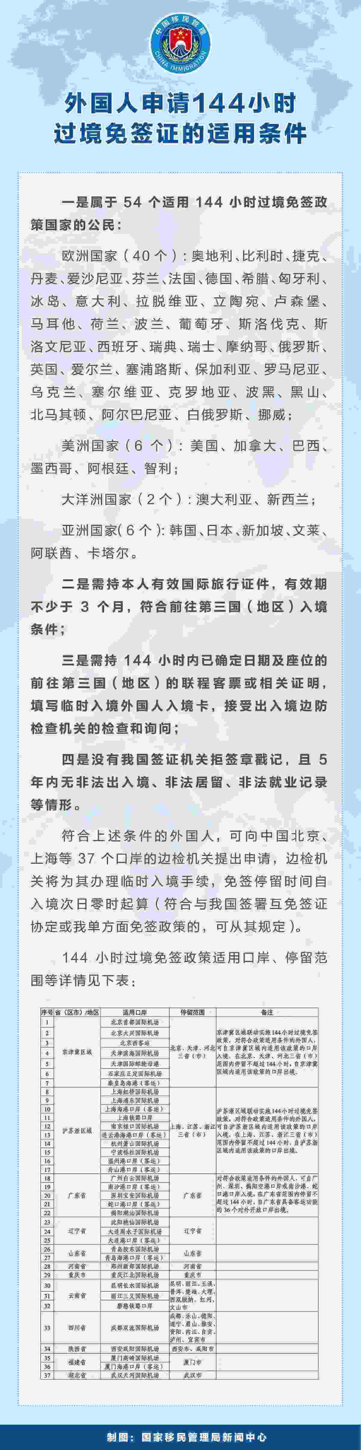 據(jù)了解,截至目前,國(guó)家移民管理局已在北京,天津,河北石家莊、秦皇島,遼寧沈陽(yáng)、大連,上海,江蘇南京、連云港,浙江杭州、寧波、溫州、舟山,河南鄭州,廣東廣州、深圳、揭陽(yáng),山東青島,重慶,四川成都,陜西西安,福建廈門,湖北武漢,云南昆明、麗江、西雙版納等地的37個(gè)口岸實(shí)施144小時(shí)過(guò)境免簽政策。美國(guó)、加拿大、英國(guó)等54國(guó)公民持有效國(guó)際旅行證件和144小時(shí)內(nèi)確定日期及座位的聯(lián)程客票從上述口岸過(guò)境前往第三國(guó)(地區(qū)),可免辦簽證在規(guī)定區(qū)域內(nèi)停留不超過(guò)144小時(shí),停留期間可從事旅游、商務(wù)、訪問(wèn)、探親等短期活動(dòng)(符合與我國(guó)簽署互免簽證協(xié)定或我單方面免簽政策的,可從其規(guī)定)。