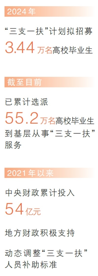 在奮斗中書寫青春華章,在奉獻中成就事業(yè)。2006年“三支一扶”計劃開展以來,50多萬名高校畢業(yè)生扎根鄉(xiāng)村,開展支教、支農、支醫(yī)等服務。2024年,“三支一扶”計劃擬招募3.44萬名高校畢業(yè)生到基層開展相關服務。