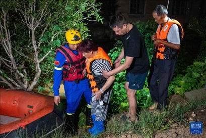 凌晨2時許,記者在決口現(xiàn)場看到,由于道路狹窄,通行不便,消防隊員扛著救生艇向受災(zāi)區(qū)域挺進(jìn),不斷有受災(zāi)群眾乘坐救生艇被轉(zhuǎn)移至安全地帶。