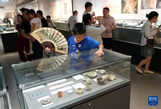 8月4日,游客在浙江省博物館孤山館區(qū)浙江西湖美術(shù)館內(nèi)觀看“發(fā)現(xiàn)杭州——2023年度杭州考古成果展”。