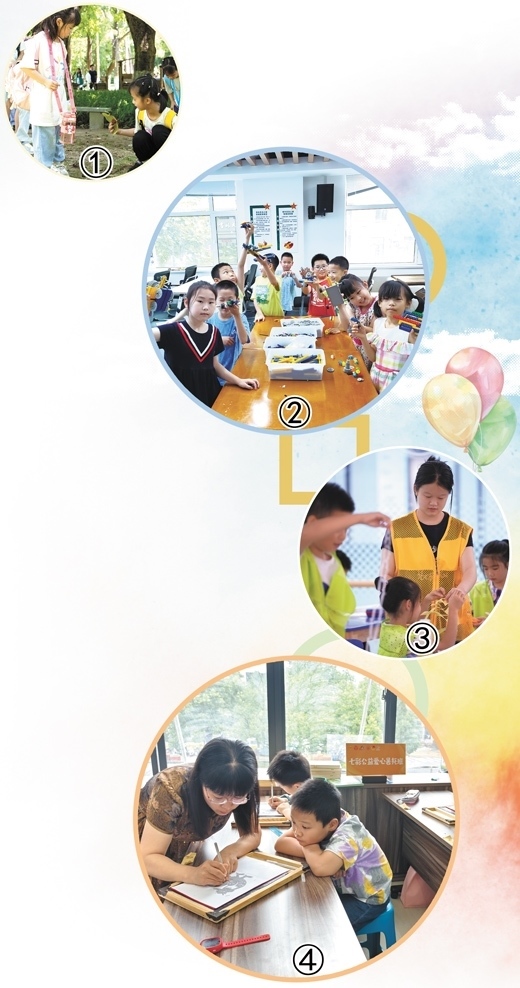 圖①:廣東省佛山市高明區(qū)組織孩子們到森林公園游覽,將研學(xué)實(shí)踐融入暑期托管。賀林平 劉鳳平攝影報道圖②:吉林省長春市義和社區(qū)暑期托管班里,孩子們在展示手工作品。常 玥攝 圖③:湖北省武漢市一個寫字樓里的暑期托管班,志愿者在照看孩子。共青團(tuán)武漢市武昌區(qū)委供圖 圖④:江蘇省宜興市振興社區(qū)暑期托管班里,老師給孩子們示范手工刻紙。趙 霞攝