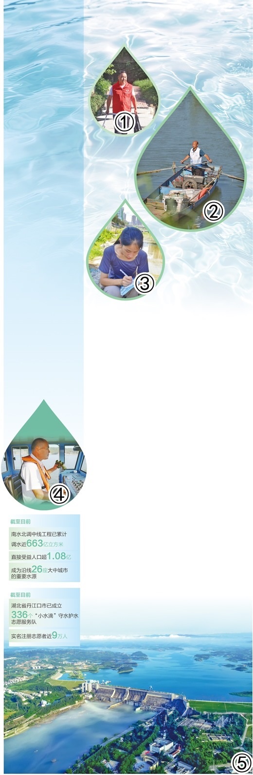 圖①:涂青海在巡線時撿拾垃圾。段 浩攝 圖②:蔣德新在巡護。丹江口市委宣傳部供圖 圖③:廖思盈在記錄水質(zhì)采樣數(shù)據(jù)。漢江師范學(xué)院供圖 圖④:肖安山在駕駛清漂船。鄖陽區(qū)委宣傳部供圖 圖⑤:丹江口水庫鳥瞰。丹江口市委宣傳部供圖 數(shù)據(jù)來源:中國南水北調(diào)集團有限公司、丹江口市委宣傳部