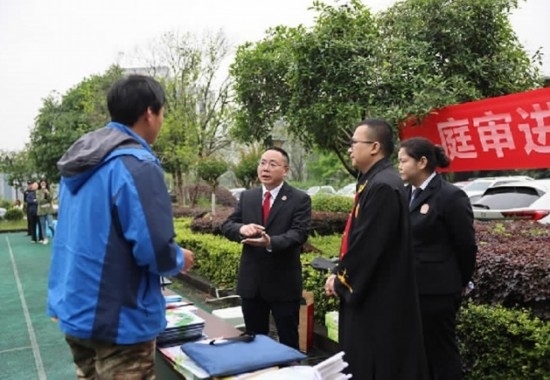 圖為重慶市渝北區(qū)人民法院在一起到企業(yè)現(xiàn)場開庭的勞動(dòng)爭議案結(jié)束后,為勞動(dòng)者普及法律知識(shí)、提供法律咨詢。 劉霞 攝