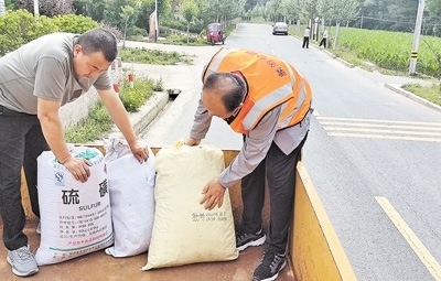 麟游縣農(nóng)村公路發(fā)展服務中心養(yǎng)護工(右)在幫助群眾裝糧食。楊雅芳攝
