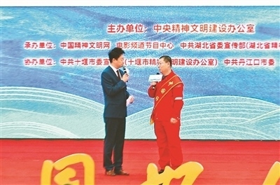 全國道德模范汪勇(右)為“中國好人”牛鈺贈(zèng)送“道德傳家寶”。