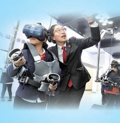 在浙江湖州市南潯區(qū)未成年人道德法治體驗館,南潯區(qū)人民法院法官(右一)指導(dǎo)小學(xué)生運用虛擬現(xiàn)實體驗設(shè)備接受法治教育。項 飛攝