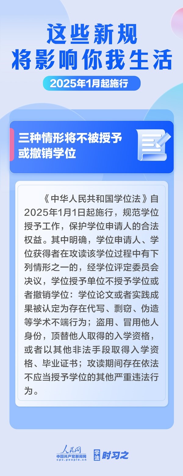 明確不授予學位或者撤銷學位的三種情形;支持優(yōu)先開發(fā)利用可再生能源;漸進式延遲法定退休年齡;完善自然科學基金資助制度……2025年1月起,這些新規(guī)施行,將影響你我生活。
