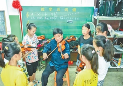 教學(xué)漸漸步入正軌后,張玉立還將支教的范圍擴(kuò)大到其他4個(gè)同樣偏僻的鄉(xiāng)鎮(zhèn)。山路崎嶇,往返山間,張玉立樂(lè)此不疲?!啊亚俾曀瓦M(jìn)大山’不僅能夠豐富孩子們的生活,還可以幫助他們走出大山?!睆堄窳⒄f(shuō),經(jīng)過(guò)一段時(shí)間的教學(xué)以后,自己開(kāi)始有意識(shí)地挑選對(duì)小提琴有興趣、有天賦的孩子,成立小提琴班,利用課外時(shí)間進(jìn)行專(zhuān)門(mén)訓(xùn)練。