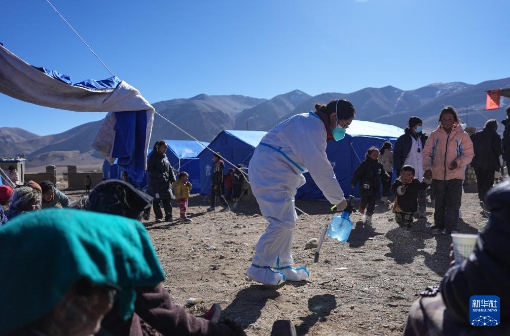 1月8日,在定日縣措果鄉(xiāng)野江村安置點,醫(yī)護人員進行消殺。