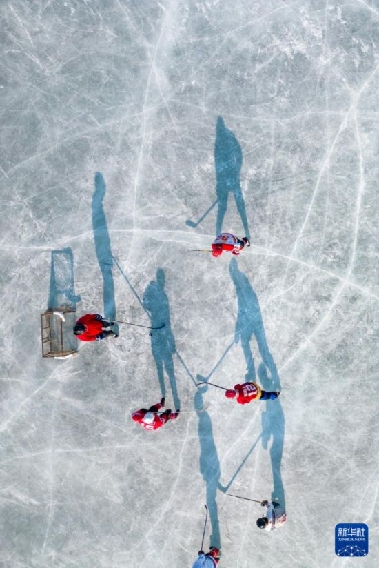 1月18日,人們?cè)诠枮I市丁香公園內(nèi)打冰球(無人機(jī)照片)。