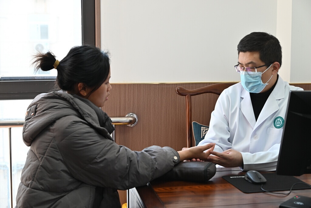1月20日,陜西省中醫(yī)醫(yī)院的中醫(yī)專家張冠杰在電子城二〇五所社區(qū)衛(wèi)生服務站中醫(yī)館為一名患者看診。林敬 攝