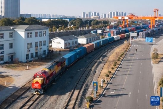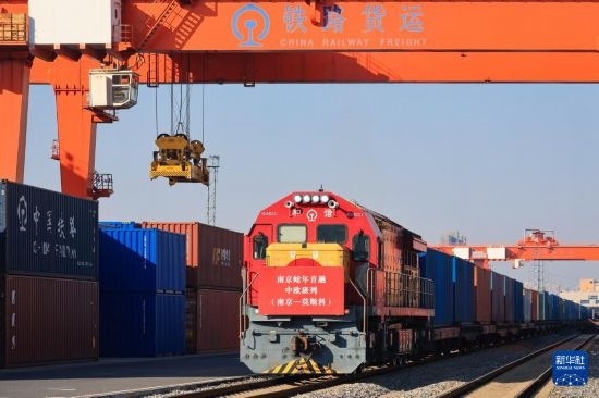1月29日,在南京鐵路物流中心堯化門站貨場(chǎng),滿載集裝箱的中歐班列準(zhǔn)備發(fā)車。