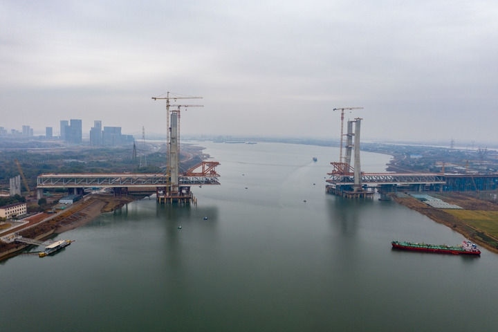 這是1月31日拍攝的昌九高鐵南昌揚(yáng)子洲贛江公鐵大橋(西支)施工現(xiàn)場(chǎng)(無人機(jī)照片)。新華社記者 郭杰文 攝