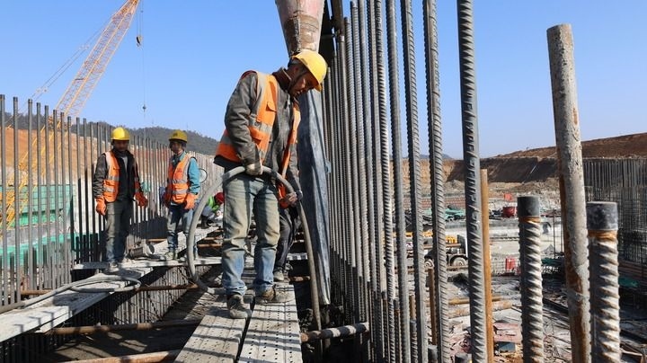1月28日,工人在江西省景德鎮(zhèn)市樂平水利樞紐工程建設(shè)現(xiàn)場(chǎng)施工。新華社發(fā)(賀蔚安 攝)