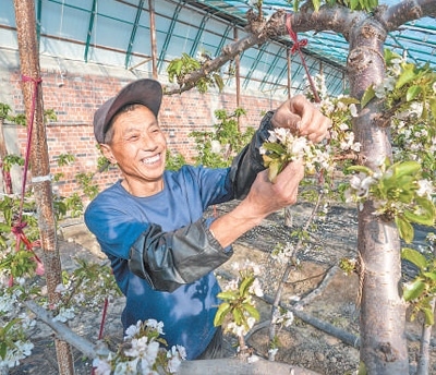 新疆生產建設兵團第十師一八八團海川鎮(zhèn)櫻桃大棚內,種植戶正在管護櫻桃樹。