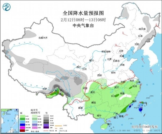 2月12日08時至13日08時,內(nèi)蒙古東北部、東北地區(qū)東部、新疆伊犁河谷和西南部山區(qū)、西藏北部和東部、青海南部、川西高原、江漢西部等地部分地區(qū)有小到中雪或雨夾雪,其中,西藏東部部分地區(qū)有大雪,局地暴雪(10~17毫米)。江南大部、華南大部、西南地區(qū)東部、西藏東南部、海南島、臺灣島等地部分地區(qū)有小到中雨,其中,福建東南部、廣東東部、臺灣島等地部分地區(qū)有大到暴雨(50~70毫米)。內(nèi)蒙古大部、華北北部等地部分地區(qū)有4~6級風;黃海、巴士海峽等海域有6~7級風。