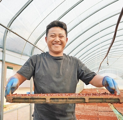 種好超級(jí)雜交水稻,秧苗質(zhì)量很重要。農(nóng)技人員要提前浸種、曬種,防治多種傳染病害。在基地,農(nóng)戶也早早準(zhǔn)備了育秧材料。倒入基質(zhì)土、送入秧盤、鋪土、澆水、撒種、蓋土……一系列工序后,育秧盤送入暗室催芽,再過(guò)兩天,擺進(jìn)溫室大棚。