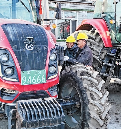 農(nóng)機(jī)庫(kù)里,社員程傳寶蹲在拖拉機(jī)旁仔細(xì)檢查,反復(fù)確認(rèn)有沒(méi)有漏油,或者零件松動(dòng)。