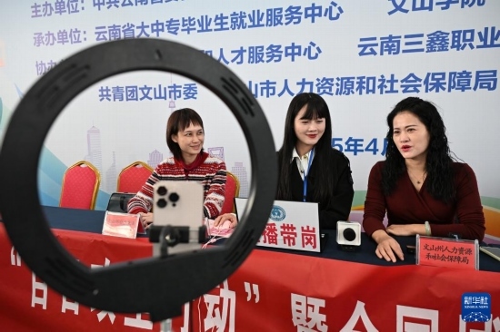 4月9日,工作人員在云南省文山學(xué)院招聘會(huì)現(xiàn)場(chǎng)進(jìn)行“直播帶崗”。