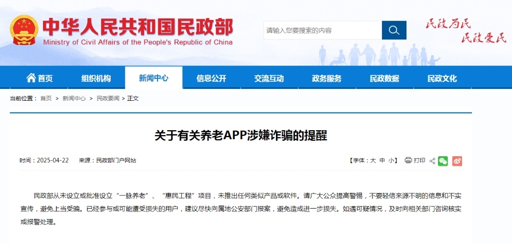 4月22日,民政部發(fā)布公告表示,民政部從未設立或批準設立“一脈養(yǎng)老”“惠民工程”項目,未推出任何類似產(chǎn)品或軟件。請廣大公眾提高警惕,不要輕信來源不明的信息和不實宣傳,避免上當受騙。已經(jīng)參與或可能遭受損失的用戶,建議盡快向屬地公安部門報案,避免造成進一步損失。如遇可疑情況,及時向相關部門咨詢核實或報警處理。(記者朱高祥)