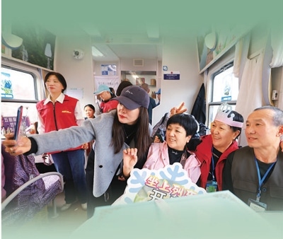 為讓銀發(fā)旅游更加精彩,銀發(fā)旅游列車不僅注重適老化改造,還通過特色主題表演,為老年游客帶來豐富的旅行體驗。在Y471次熊貓旅游專列上,游客們可以欣賞到別具特色的川劇變臉。在黑龍江的冰雪旅拍主題旅游列車上,車廂內(nèi)融合哈爾濱各類景點進行主題場景設(shè)計,老年游客只需掃碼預(yù)約便可換上不同風(fēng)格的服裝在車廂內(nèi)拍照打卡。列車上,老年游客不僅樂趣十足,還留下許多美好回憶。