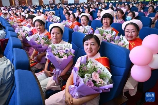 5月9日在內(nèi)蒙古自治區(qū)婦幼保健院學(xué)術(shù)報(bào)告廳拍攝的接受表彰的護(hù)士們。